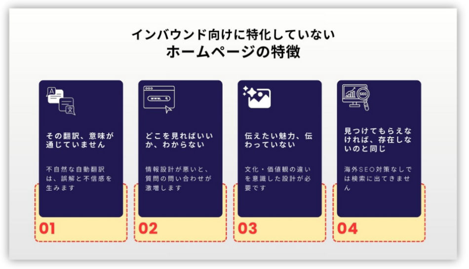 単なる翻訳ではなく、文化背景に合わせた表現、検索エンジン対策、迷わせない導線設計など、成果につながる工夫を網羅。